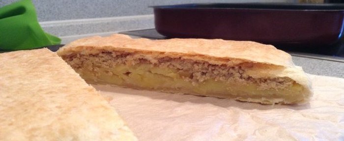 Pour accélérer le processus de cuisson, nous utilisons une pâte feuilletée de magasin, bezdorozhevoe, pâte congelée avec une composition minimale. Toujours lire attentivement l'étiquette, les fabricants proposent différentes recettes, nous avons acheté en pâte Auchan sans E-additifs, mais avec de la margarine. À la fin de l'article, je vais vous dire comment préparer une pâte maison utile.